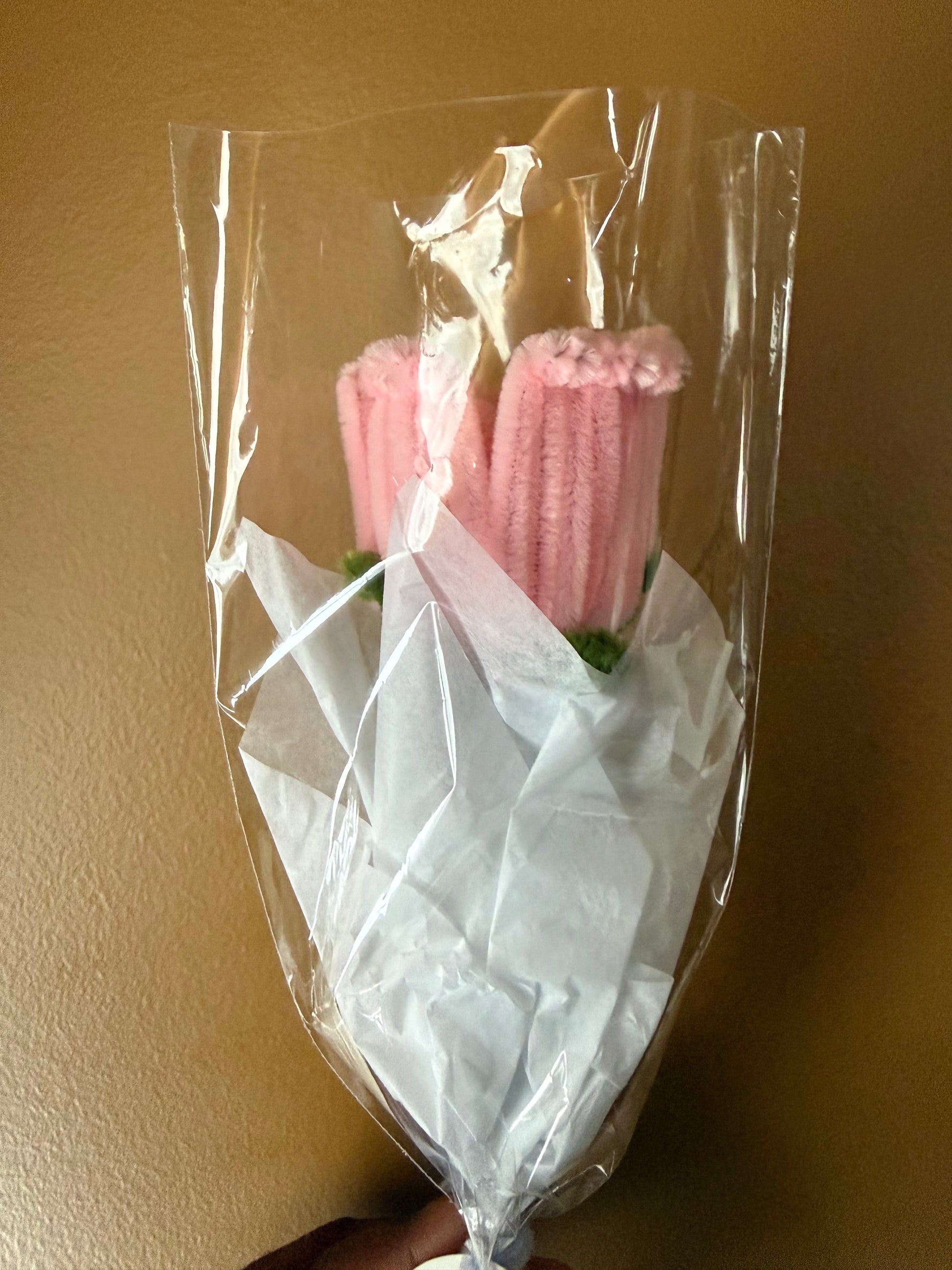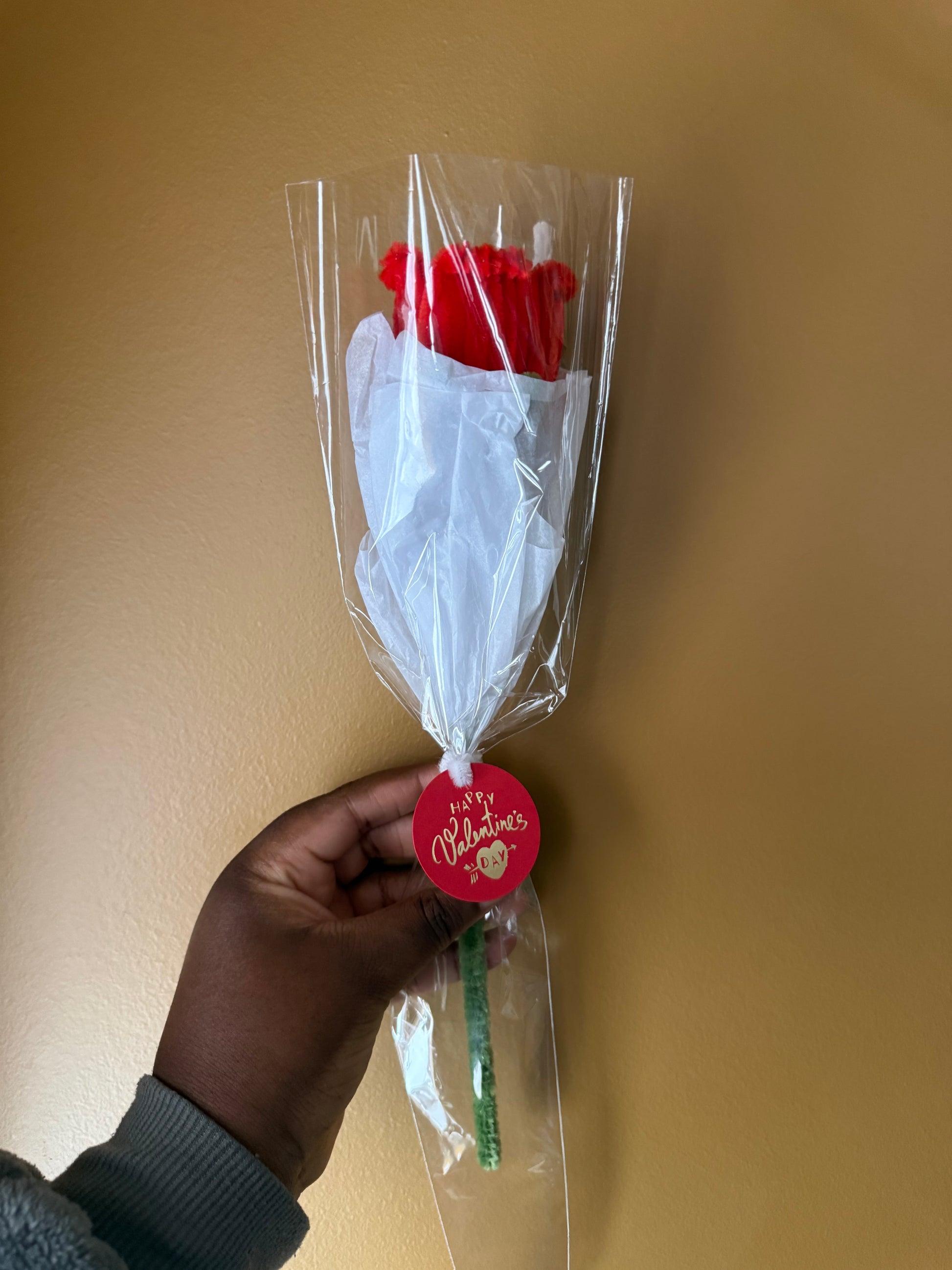 This single handmade rose bloom is a timeless Valentine’s Day gift, carefully crafted using soft pipe cleaners and wrapped for gifting.